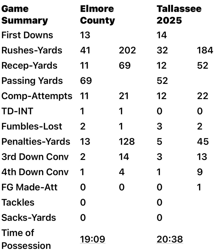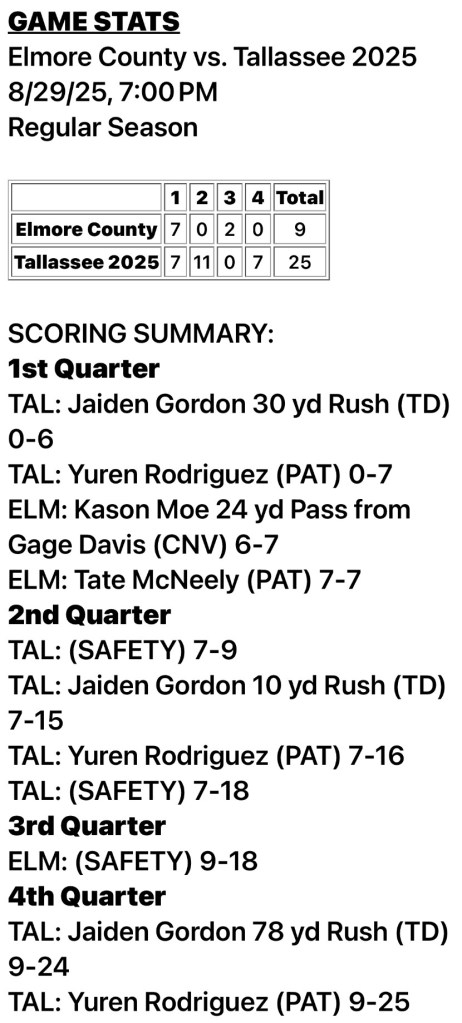 What a difference a week makes. The season opener for the Tallassee football team could not have been any worse last Friday. Fast-forward seven days. Tallassee beat rival Elmore County 25-9 at J.E. “Hot” O’Brien Stadium to pick up win No. 1 of 2025.