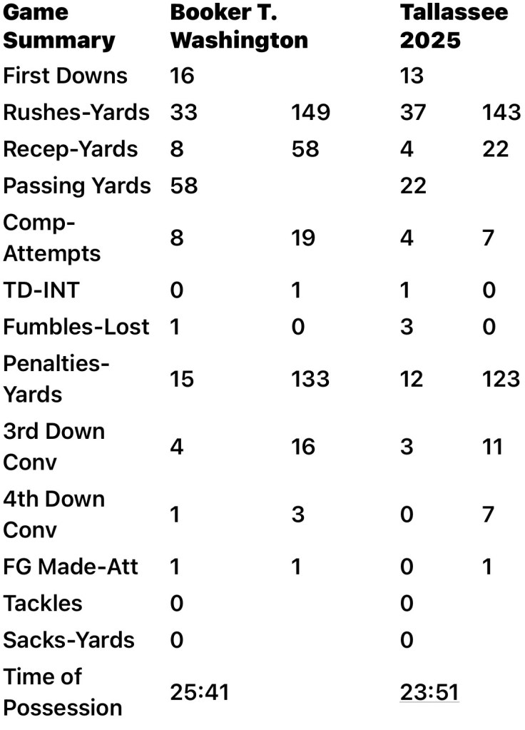 BTW (2-1/2-0) won the battle of field position in the second half. Their first points came on a scoop and score with Tallassee backed up deep in its own territory.