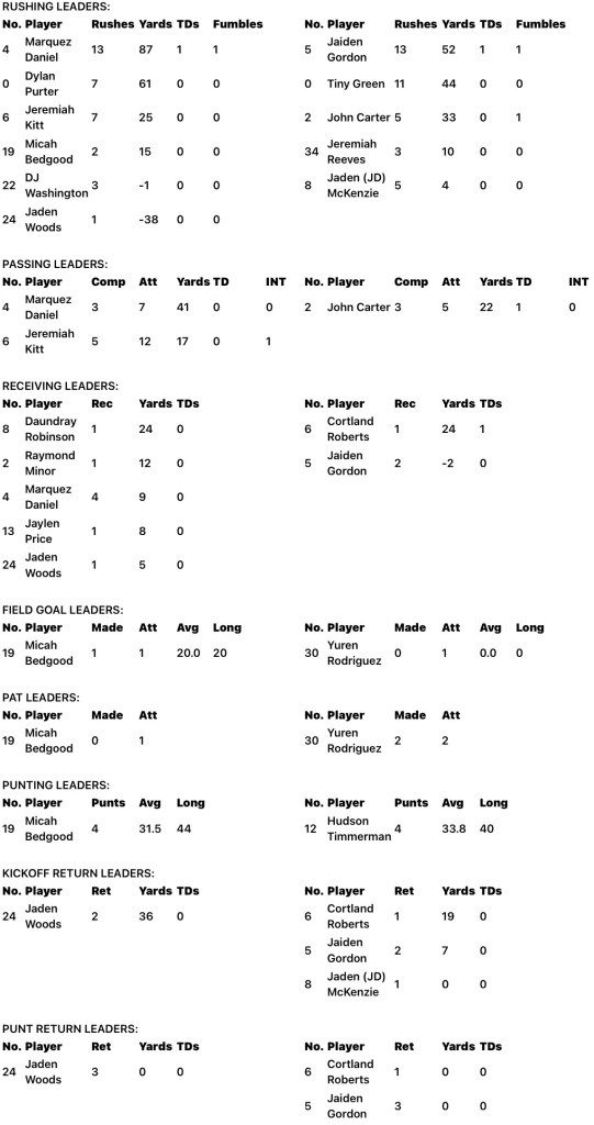 Tallassee (2-2/1-1) built its early lead with a sensational 24-yard one-handed catch by Cortland Roberts on a pass from John Carter in the first quarter. The second touchdown came in the second quarter on a 2-yard run by Jaiden Gordon, his sixth TD of the season.