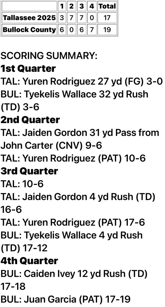 It was another game that came down to the wire. It was also another tough region loss for Tallassee. Bullock County beat the Tigers 19-17 on Friday in Union Springs.