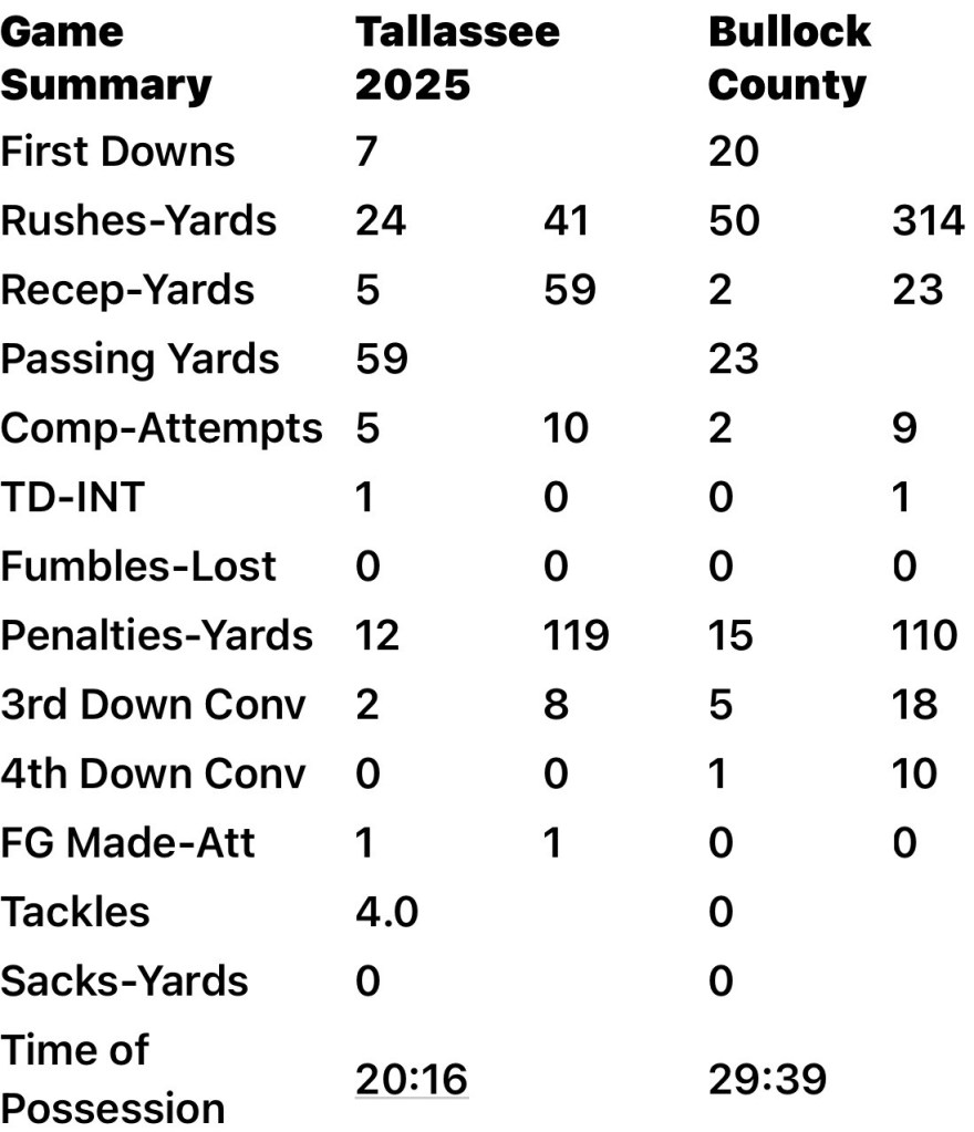 The loss drops Tallassee to 2-3 overall and 1-2 in Class 4A/Region 3 play. Bullock County improved to 5-0 and 3-0 in the region. It is the best start for the Hornets since 1972.