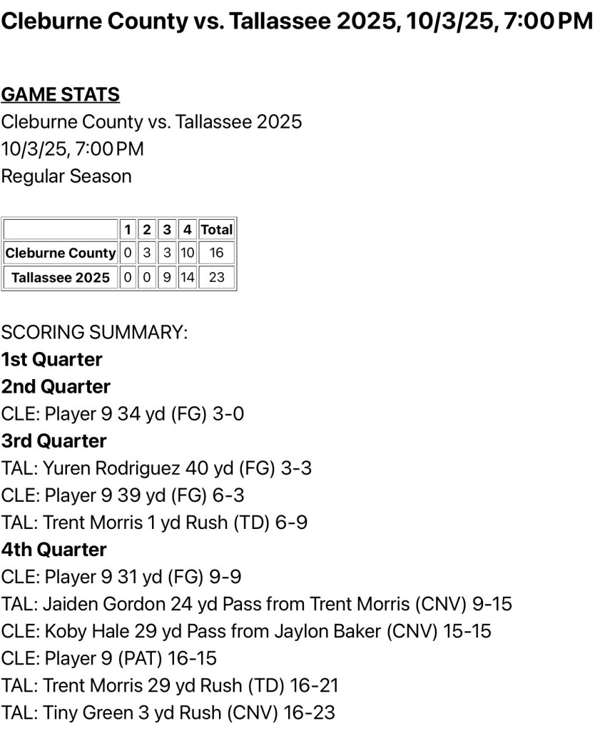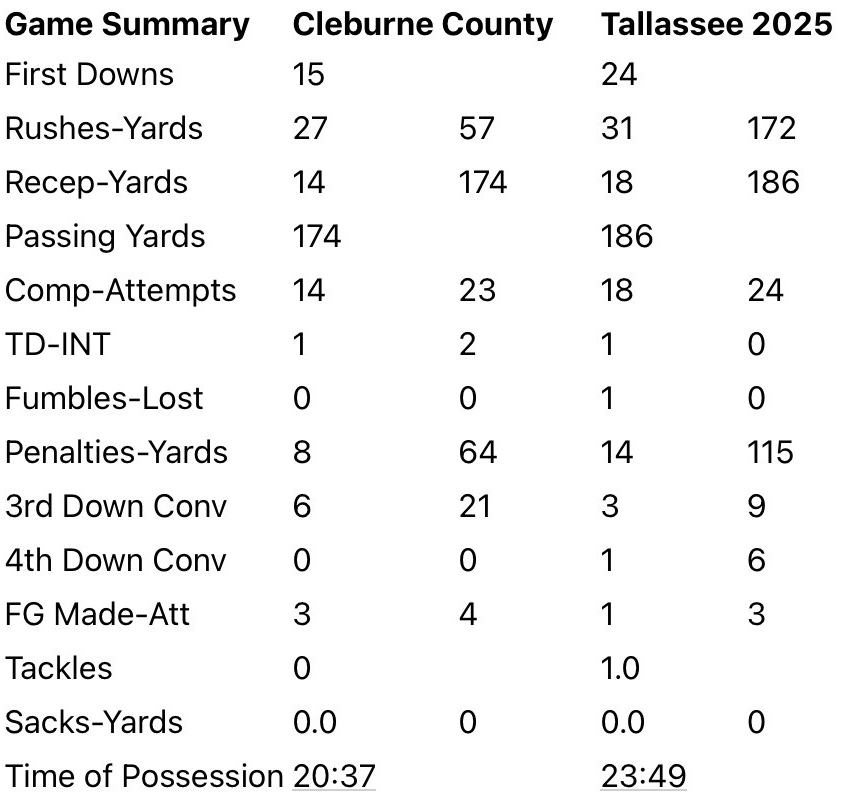 Tallassee improved to 3-3 and 2-2 in Class 4A/Region 3 keeping their playoff hopes alive. Cleburne County fell to 2-4 and 1-3.