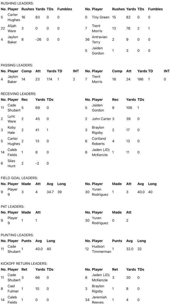 Tallassee scored all of its points in the second half after trailing 3-0 at intermission. Tiny Green ran for 82 yards on 13 attempts. Gordon had eight receptions for 106 yards. Gordon also had a game-sealing interception on defense. Tra’mel McCoy added another defensive pick.