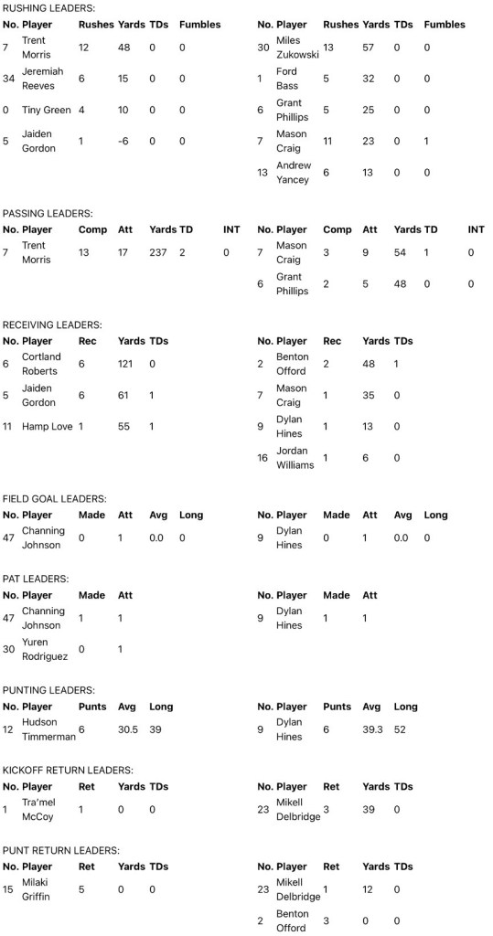 THS quarterback Trent Morris was 13 of 17 for 237 yards and two touchdowns. He hit Hamp Love for the game’s only score of first half, a 55-yard score in the second quarter.