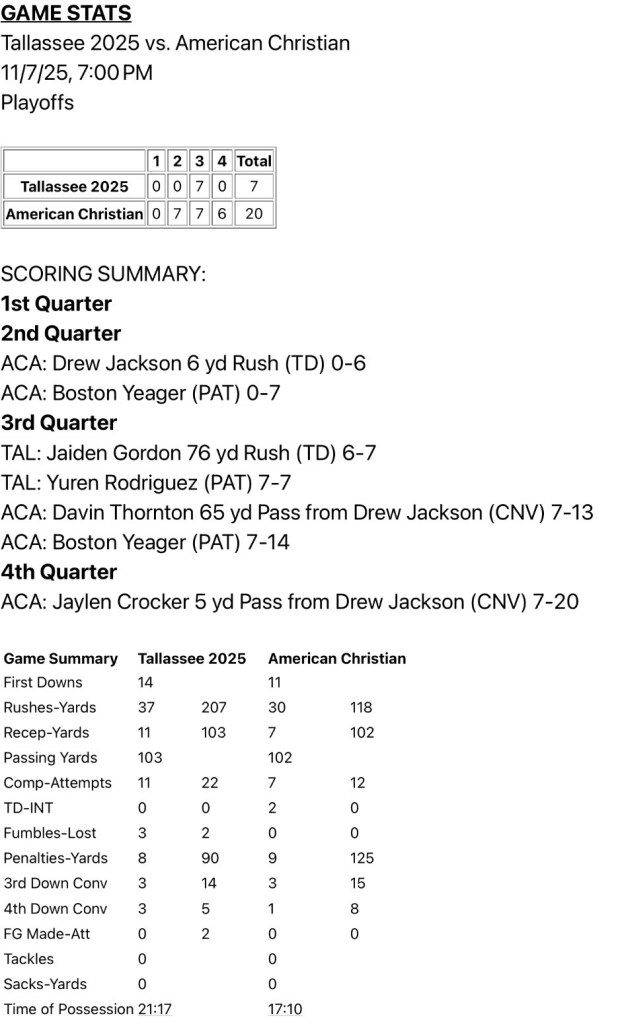 Tallassee hoped to find the magic that led them to a deep playoff run a season ago. It was just not meant to be. The Tigers fell to American Christian 20-7 in the first round on Friday in Tuscaloosa ending their season with a 6-5 record.