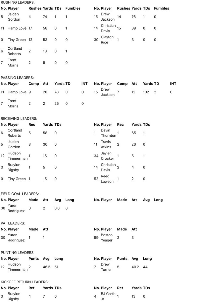 Yuren Rodriguez missed a couple of first-half field goals of 49 and 30 yards and after Drew Jackson’s 7-yard scamper Tallassee trailed 7-0 at the break.