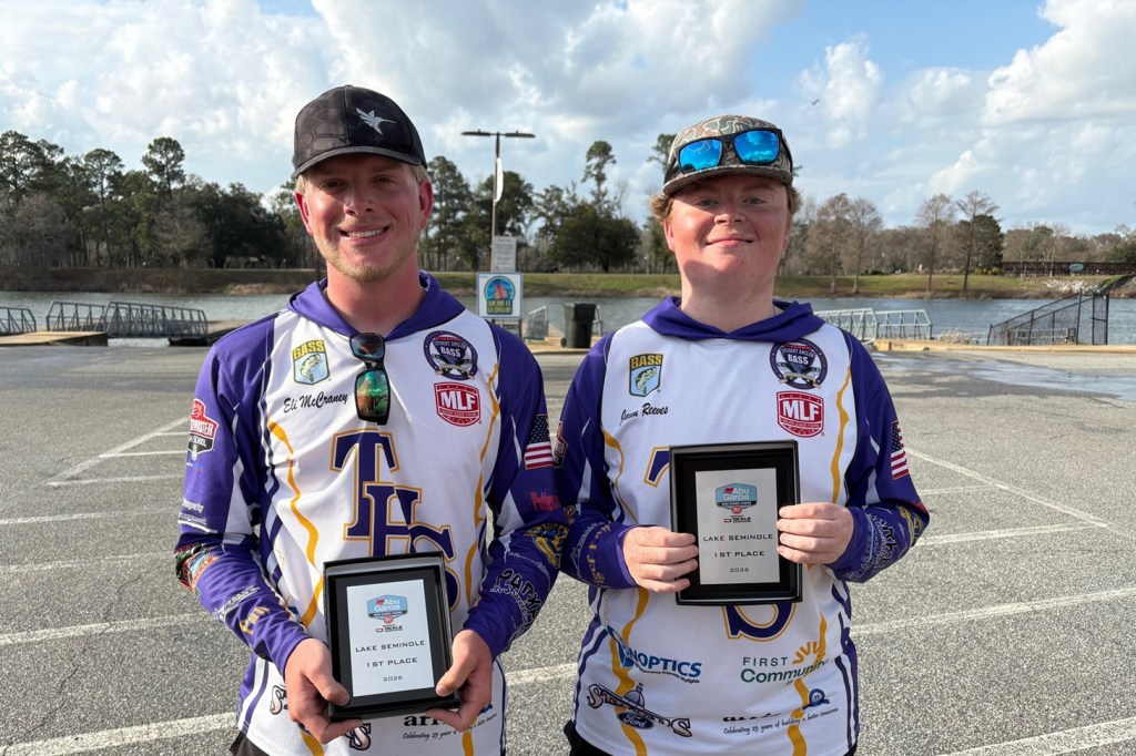 The Tallassee High School fishing team of Eli McCraney and Jaxon Reeves brought five bass to the scale Saturday weighing 15 pounds, 2 ounces to win the MLF Abu Garcia High School Fishing Presented by Tackle Warehouse Open on Lake Seminole Presented by Columbia PFG in Bainbridge, Ga.